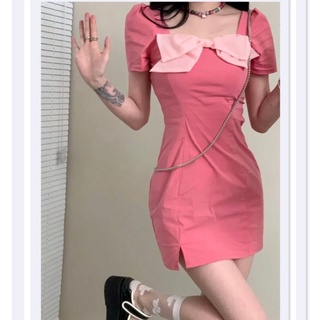 Đầm PERTY cổ vuông màu hồng đính nơ phong cách Pháp retro thời trang dành cho nữ