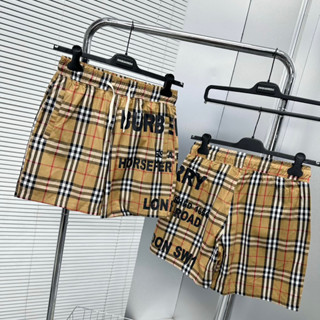 Quần short gió nam BBR hoạ tiết kẻ sọc caro be in chữ Burberry Horseferry 1856 cạp chun lót lưới QS90P