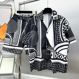 Bộ đồ nam đi biển Pijama vải lụa hoạ tiết sọc kẻ logo Dolce monogram đen trắng sang trọng thoáng mát