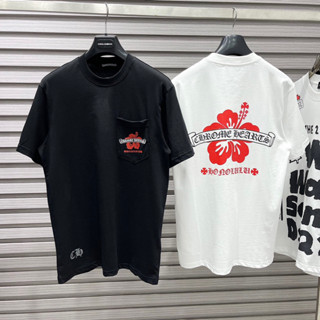 Áo phông nam nữ Premium Cotton in chữ Chrome Hearts túi ngực phối hình bông hoa đỏ hai mặt vintage