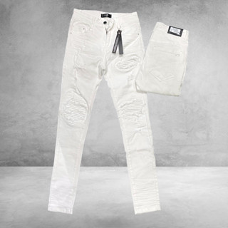 Quần jean bò nam Amiri skinny trắng rách đùi gối vá da nhăn trắng dập nhăn 3D ống cao cấp