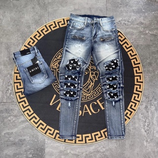 Quần Bò Nam Amiri Vải Nhăn Hoạ Tiết Thêu Khoá Zip Đùi Gối QJ146P