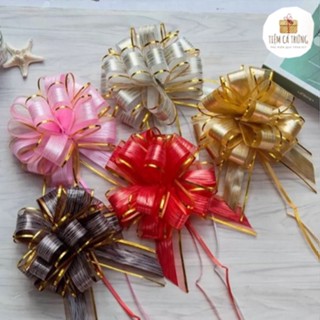 [N06] [SET 1C/5C][SIZE NHỎ 30] Nơ Rút Trang Trí Cháp Tết Tú Cầu Voan Sọc Viền Vàng Bông Nhỏ size 12*15cm - Tiệm Cá Trứng