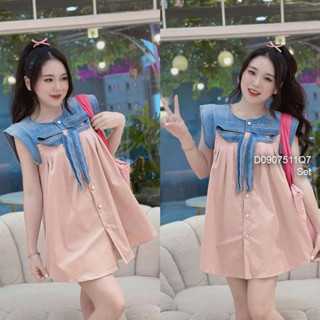 Đầm jean dáng suông một túi cổ bẻ kèm đai