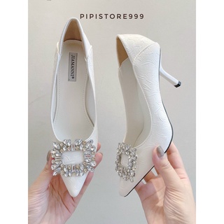 Giày Cao Gót Cô Dâu Da Vân Sần Đính Đá Vuông Gót Nhọn Cao 7cm G125