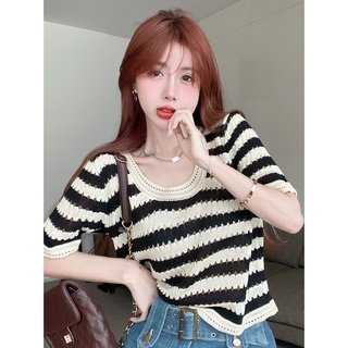 Porozi Áo dệt kim ngắn tay họa tiết kẻ sọc thời trang Hàn Quốc cho nữ