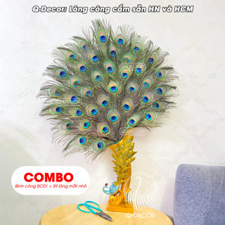 Bình cắm lông công Q Decor BXL bằng nhựa và 36 lông công phong thủy mắt to 4-6cm
