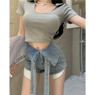 QADCOL Bộ Áo polo Ngắn Tay Ôm Dáng + Quần Short Denim Lưng Cao Phối Thắt Lưng Cá Tính