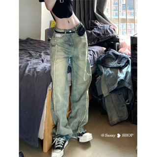 QADCOL Quần jean ống suông Màu Xanh Dương Hoài Niệm Thôn Viền Thô Kiểu retro Mỹ Cho Nữ