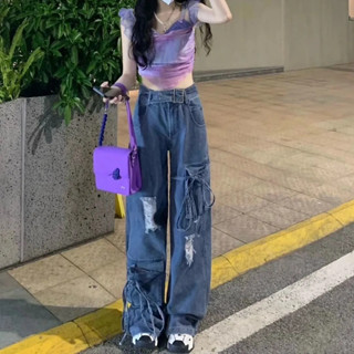 QADCOL Quần Jean Dài Ống Rộng Lưng Cao Phối Rách Thời Trang Mùa Hè Cho Nữ