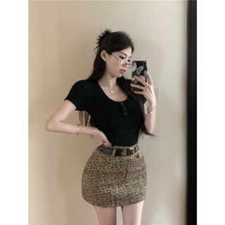 QADCOL Show Áo Thun Mỏng Ngắn Tay Giả Hai Lớp Che Bụng Phối Khóa Kim Loại Cho Nữ