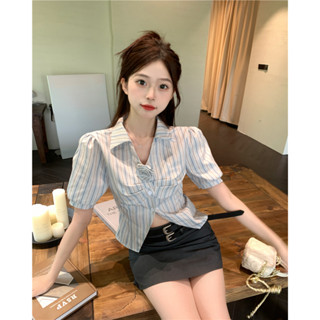 QADCOL Áo Sơ Mi Dài Tay Cổ Chữ V Họa Tiết Kẻ Sọc Thiết Kế Mỏng Thời Trang Mùa Hè Theo Phong Cách Pháp