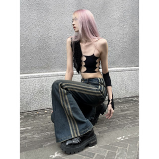 QADCOL Quần denim Lưng Cao Kẻ Sọc Bên Hông Phong Cách retro Đường Phố Mỹ Cho Nữ