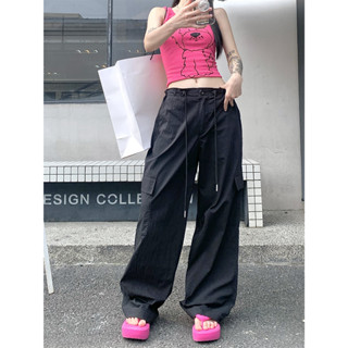 QADCOL Quần Dài Thể Thao Ống Rộng Lưng Thấp Màu Đen Phối Túi Thời Trang Mùa Hè Cho Nữ