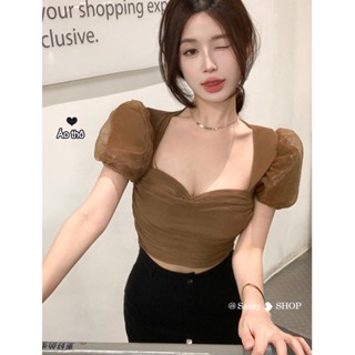 QADCOL Áo Lưới Tay Phồng Xếp Ly Ôm Dáng Màu Trơn Gợi Cảm Thời Trang Xuân Hè Cho Nữ