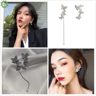 Cặp khuyên kẹp vành tai hình bướm màu bạc phối tua rua dài không đối xứng kiểu retro cho nữ