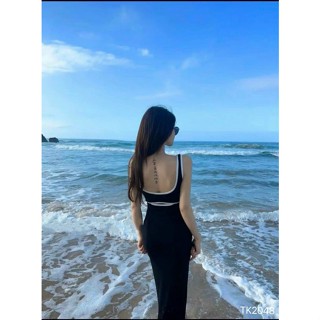 Đầm thun body đen viền trắng cut out lưng sexy