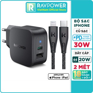 Combo Củ Sạc Nhanh PD 3.0 30W QC 3.0 18W RP-PC132 & Cáp USB Type C to Lightning MFI C94 20W 2M RAVPower RP-CB01005-B