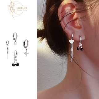 Set 4 Khuyên Tai Hình Trái Cherry/ Khóa Dây Xích Màu Đen Dành Cho Nữ