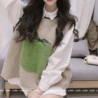 Set Áo Len Không Tay Họa Tiết Hoa Và Áo Sơ Mi Dáng Rộng Phong Cách Ngọt Ngào Cho Nữ