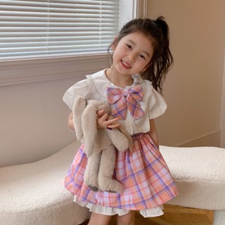 Set Bé Gái Bộ Áo Sơ Mi Ngắn Tay Cổ Búp Bê Thắt Nơ Họa Tiết Sọc Caro + Quần Short Thời Trang Mùa Hè Cho Bé Gái Se7