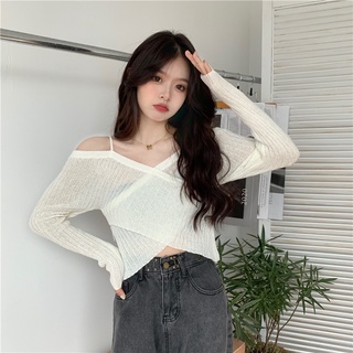 QKOOLE Áo croptop dệt kim tay dài cổ chữ V phong cách Hàn Quốc thời trang dành cho nữ