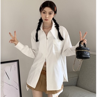 QKOOLE Áo sơ mi tay dài dáng rộng màu trơn có khóa kéo đôi phong cách Hàn Quốc cho nữ