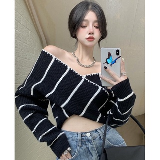 QKOOLE Áo Croptop Dệt Kim Tay Dài Trễ Vai Cổ Chữ V Hoạ Tiết Kẻ Sọc Phong Cách Hàn Quốc Cho Nữ
