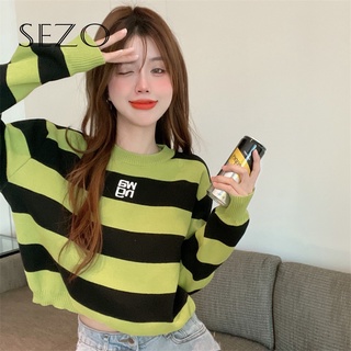 QKOOLE Áo croptop Sweater Tay Dài Dáng Ôm Kẻ Sọc Thời Trang Hàn Quốc Cho Nữ