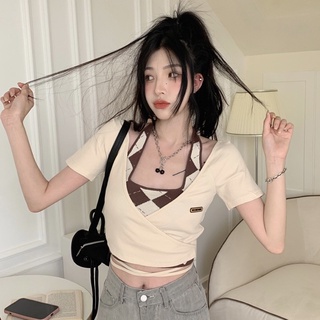 QKOOLE Set Áo Lửng Hai Dây Cổ Chữ V + Áo Khoác Cộc Tay Họa Tiết Ca Rô Thời Trang Nữ