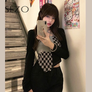 QKOOLE Áo họa tiết sọc caro phong cách Hàn Quốc quyến rũ hợp thời trang cho nữ