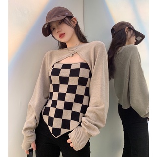 QKOOLE Áo hai dây dệt kim sọc ca rô và áo khoác dệt kim phong cách Hàn Quốc dành cho nữ