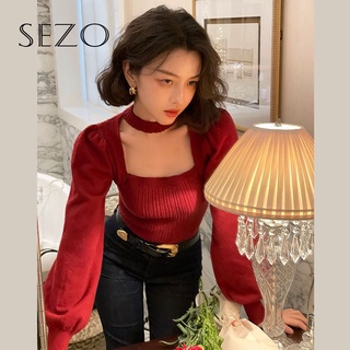 QKOOLE Áo dệt kim cổ vuông màu đỏ/ đen phong cách Hàn Quốc thời trang cá tính cho nữ