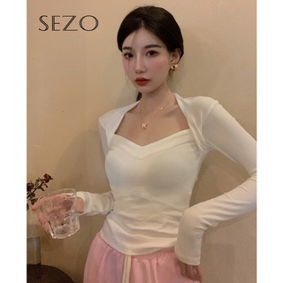 QKOOLE Áo Croptop Dệt Kim Tay Dài Cổ Vuông Màu Sắc Đơn Giản Phong Cách Hàn Quốc Cho Nữ