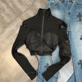 Áo Mùa Thu 2022 Cổ Đứng Tay Dài Hở Vai Có Túi Và Dây Rút Trang Trí Dưới Đường Phố Cá Tính
