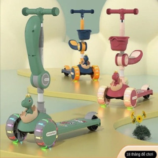 Xe trượt scooter khủng long ghế ngồi có giỏ trước đèn & nhạc, loại bánh to, bánh xe phát sáng cho bé vui chơi, vận động