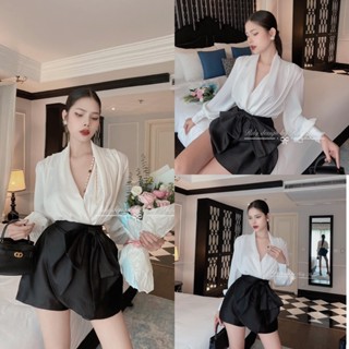 [ 𝐅𝐑𝐄𝐄 𝐒𝐇𝐈𝐏 ] Sét áo sơ mi xếp ly tay bồng cổ chéo mix quần váy nơ tafa cực xinh Sơ mi lụa hàn mềm mướt cv tafa
