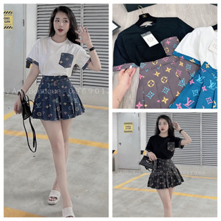 [ 𝐅𝐑𝐄𝐄 𝐒𝐇𝐈𝐏 ] Set áo phối túi mix chân váy xếp ly LV hot hit Áo cotton khô QC l1 dày dặn, nẹp viền cổ cẩn thận, phối tay