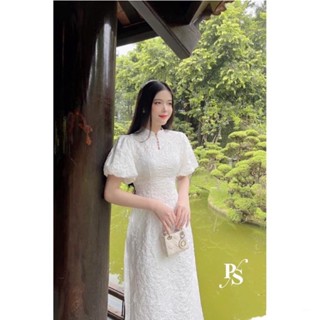 [ 𝐅𝐑𝐄𝐄 𝐒𝐇𝐈𝐏 ] Set áo dài hoa nổi tay bồng siêu phẩm về phiên bản màu trắng Vải hoa xốp nổi QC cao cấp chuẩn y mẫu, cúc