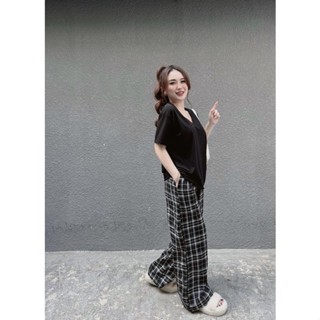 [ 𝐅𝐑𝐄𝐄 𝐒𝐇𝐈𝐏 ] Bộ basic cổ tim, áo cotton tàu form thụng Quần kẻ thô loại 1, form rộng