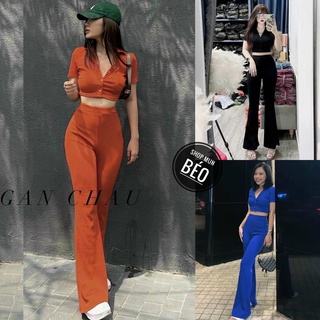 Set bộ quần dài ống rộng kèm áo croptop tay ngắn cúc ngực chất thun gân thích hợp mặc đi làm đi chơi