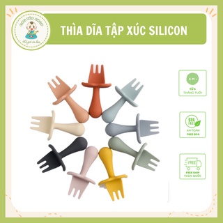 Thìa dĩa tập xúc silicon cán ngắn có nút chặn 5 màu phong cách Hàn quốc xinh xắn cho bé tập ăn