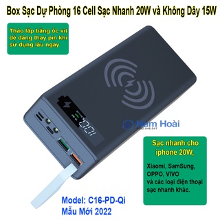 Box sạc dự phòng 16 cell C16 PD Qi sạc nhanh 22.5W và sạc không dây 15W (Không gồm pin)