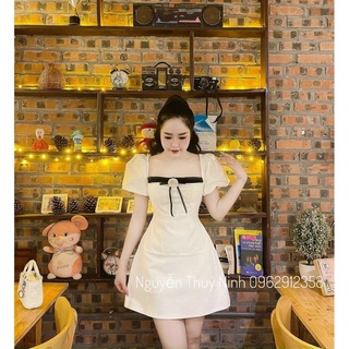 Đầm thời trang nữ mặc đi chơi chất gấm cổ vuông có mút đính cườm tay búp váy xoè đen và trắng