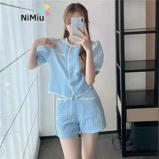 Sét Bộ Thời Trang Nữ Đi Chơi- Sét Bộ Thun Gân Đùi Sọc Thêu Chữ Miumiu Cổ Sơ Mi Mix Quần Đùi Có Lưng Bản