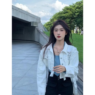 Áo Khoác Denim Ngắn Màu Trắng Phối Dây Xích Có Thể Tháo Rời Thời Trang Xuân Thu Cho Nữ
