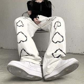 Quần Jean Dài Ống Rộng Màu Trắng Họa Tiết Trái Tim Phong Cách Retro Thời Trang Thu Đông Mới Dành Cho Nam Và Nữ LT7n