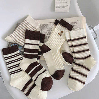 Túi 10 Đôi Tất dệt kim cổ cao kẻ thêu hình Phong Cách Vintage Hàn Quốc Mẫu Softie tt15