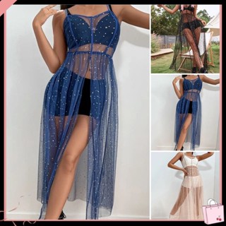 {Soltweter} Đầm Hai Dây Phối Lưới Viền Xẻ Tà Trang Trí Kim Sa Trong Suốt Thời Trang Mùa Hè Dành Cho Bạn Nữ