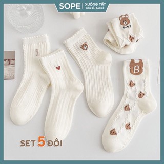 Tất nữ cổ ngắn họa tiết gấu dễ thương, set vớ 5 đôi chất liệu vải co giãn thoáng khi - Sope Shop